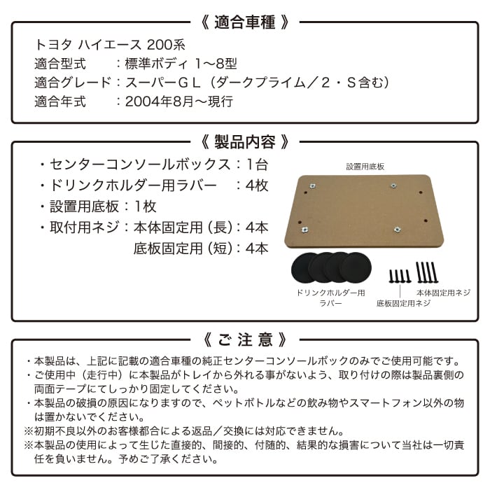 トヨタ ハイエース200系(標準ボディ)用のセンターコンソールボックスです。