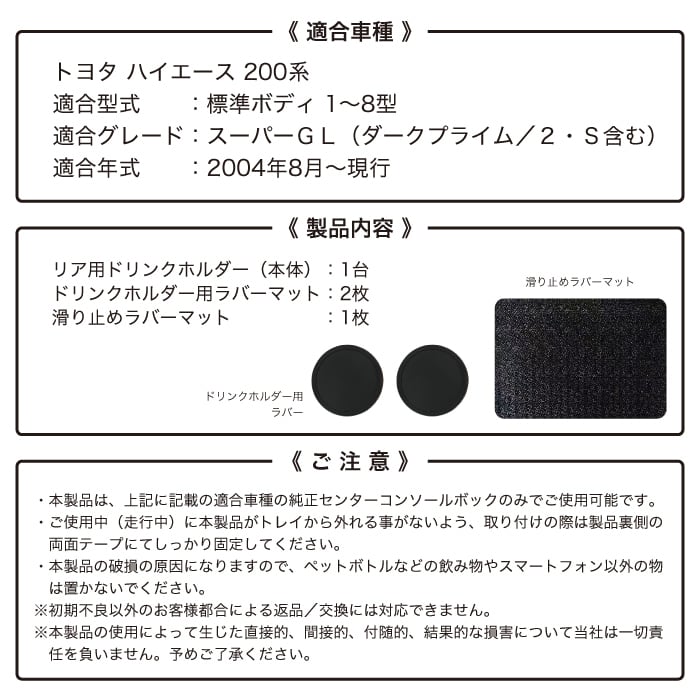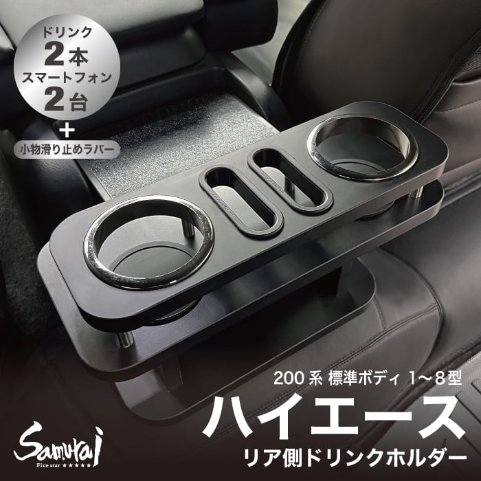 トヨタハイエースの純正センターコンソールボックスにセットして使える、実用性とインテリア性を持ち合わせた「リア用ドリンクホルダーテーブル」です。純正コンソールボックス後側のドリンクホルダーにセットするだけで車内空間をドレスアップします!