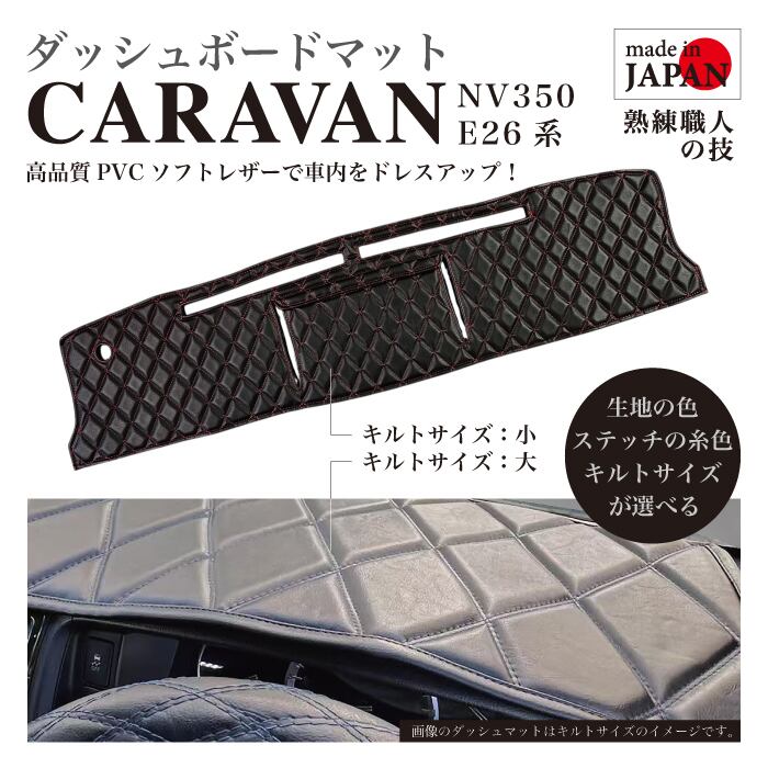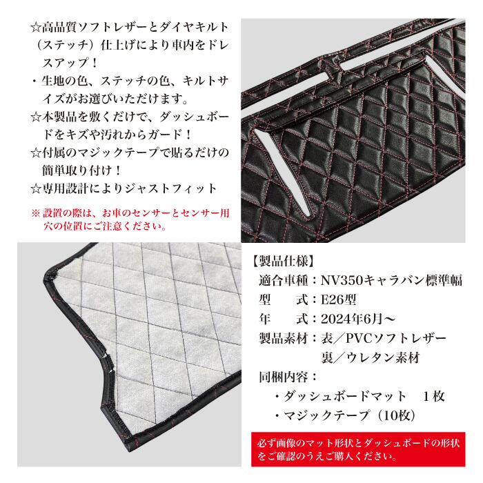 NV350キャラバン E26系用ダッシュボードマットです。高級感溢れるPVCソフトレザーがダッシュボードをオシャレにドレスアップします。また、本製品を設置する事でダッシュボードをキズや汚れから守ります。