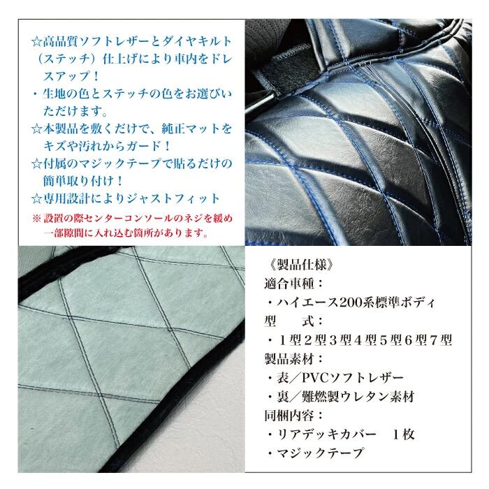 トヨタハイエース 200系 標準ボディ用リアデッキカバーです。高級感溢れるPVCソフトレザーが足元をオシャレにドレスアップします。本製品を設置する事で、純正マットをキズや汚れから守ります。